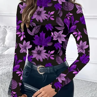 TEMU Bluzka Damska Elegancka z Długim Rękawem - Półprzezroczysty Kwiatowy Wzór Brązowo-Żółty, Elastyczna do Stylizacji Formalnych i Codziennych –