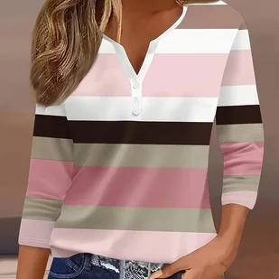 TEMU Bluzka Damska z Dekoltem w Serek i Paskami, 3/4 Rękawy - Miękki Poliester, Luźny Krój, Krótki Rękaw w Kolorach Różowym, Białym i Szarym, Idealna