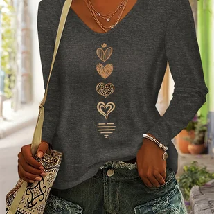 TEMU Bluzka Damska z Długim Rękawem i Dekoltem w Serek – Miękkie Koszulki z Wzorem Serduszek (Złoty/Beżowy/Turkusowy/Brunatny/Czarny/Biały/Szary) –