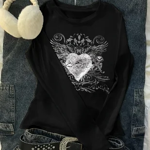 TEMU 2089 - Damska Bluzka z Długim Rękawem, Slim Fit, Modna, Casual, z Nadrukiem , Skrzydeł i Róży, Trendy, Elegancka Warstwowa Koszulka na Wiosnę i