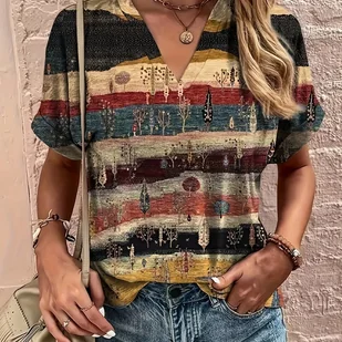 TEMU Bluzka damską z krótkim rękawem, okrągłym dekoltem, kolorowym abstrakcyjnym nadrukiem, lekką poliestrem, modna na każdą porę roku, dla