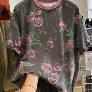 TEMU Bluzka Damska z Kwiatowym Nadrukiem – Ciemnoszara z Różowymi Różami, Okrągły Dekolt, Krótki Rękaw, Nieprześwitująca Tkanina na Codzień i Na