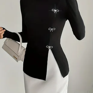 TEMU Bluzka z Długim Rękawem i Rozcięciem, z Akcentem z Cyrkonii - Elegancka, Jednokolorowa, Dopasowana, Pranie w Pralce, Średnio Elastyczna, Idealna