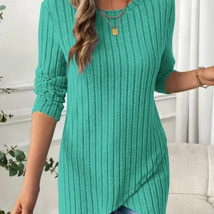 TEMU Bluzka z Długim Rękawem w Kolorze Turkusowo-Zielonym - Elegancki Top z Asymetrycznym Dołem, Średnio Elastyczna i Odporna na Zagniecenia Koszula
