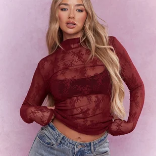 TEMU Bluzka z Koronką w Kolorze Burgundowym Czerwonym z Kwiatowym Nadrukiem - Długi Rękaw, Obcisły Fason, Stójka, Elastyczna i Pranie Maszynowe na
