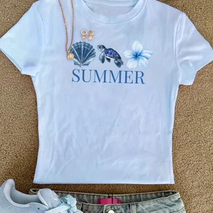 TEMU Damska Biała Koszulka Y2K Koreańska Letnia Plażowa - Krótki Rękaw z Nadrukiem Turkusowego Żółwia Morskiego i Muszli oraz Hawajskich Kwiatów