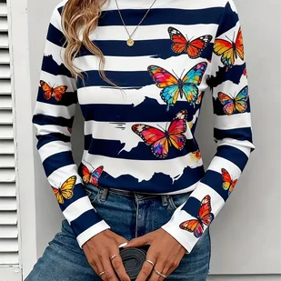 TEMU Nowy damski casualowy T-shirt z długim rękawem, okrągłym dekoltem, w paski z nadrukiem motyla na wiosnę/jesień