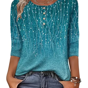 TEMU Damska Bluzka z Krótkim Rękawem w Turkusowym Kolorze z Nadrukiem na Całości - Koszula z Guzikami i Okrągłym Dekoltem 3/4, Casualowa i Elegancka