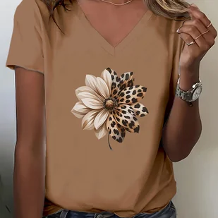 TEMU Damska Koszulka z Dekoltem w Serek w Leopardzie i Kwiaty – Miękka, Oddychająca Czysta Bluzka, Beżowa i Brązowa Codzienna Koszulka na Wszystkie
