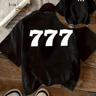 TEMU Damska koszulka z okrągłym dekoltem i śmiałym nadrukiem „777” - stylowa koszulka z krótkim rękawem na wiosnę i , czarna koszulka z poliestru,