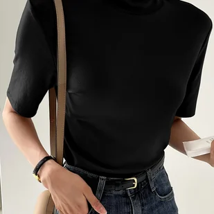 TEMU Damska koszulka z wysokim dekoltem - krótki rękaw, jednokolorowy czarny, letni top na co dzień z dekoracją falbaniową, nadaje się do prania w