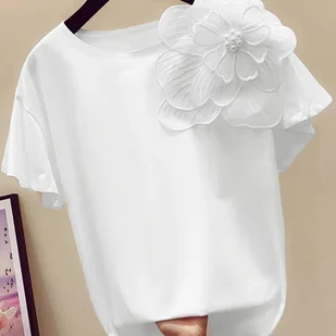 TEMU Casualowa Modowa Damska Koszulka z Okrągłym Dekoltem, Jednokolorowa, Krótki Rękaw, Trójwymiarowy Kwiatowy Wzór, Wiosna