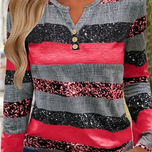 TEMU Damski sweter casualowy z długim rękawem i dekoltem w kształcie litery V z kolorowymi paskami i fałszywymi guzikami - idealny na jesień i zimę,