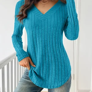 TEMU Damskie Swetry z Dekoltem w Serek i Żebrowanym Wzorem - Miękka Tkanina o Średniej Elastyczności, Casualowa Koszulki długi Raglan Jednokolorowe