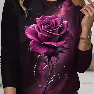 TEMU DP101005 Elegancka Damska Koszulka z Długim Rękawem w Kolorowe Fioletowe Róże i Kosmicznym Wzorze Kwiatowym, Okrągły Dekolt, Pranie Maszynowe,