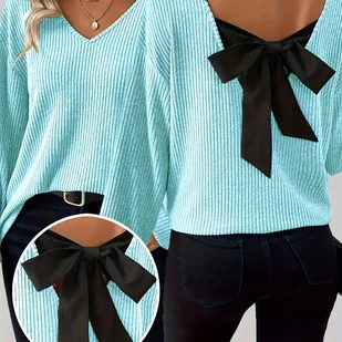 TEMU Elegancka Bluzka Damska z Dekoltem w Serek i Kokardą na Plecach - Turkusowy Niebieski & Czarny Jednolity , Dopasowany Krój, Możliwość Prania W