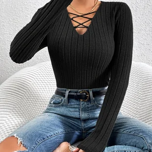 TEMU Elegancka Bluzka Damska z Dekoltem w Serek i Warkoczami - Czarna, Ciepła na Zimę Średnio Elastyczna Pranie Maszynowe Casualowa Warstwowana