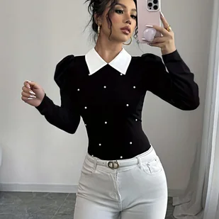 TEMU Elegancka Bluzka Damska z Kołnierzykiem Ozdobionym Perłami - Długi Rękaw, Biało-Czarny Zapinany Przód, Antykurzowa Bluzka na Każdą Porę Roku,