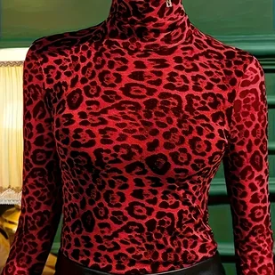 TEMU Elegancka bluzka damskiej z wysokim dekoltem i długim rękawem - Seksowny top z siatką w panterkę, dopasowany, półprzezroczysty, czerwono-czarny