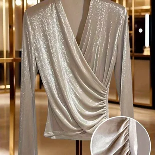 TEMU Elegancka Bluzka z Długim Rękawem i Dekoltem w Serek z Przecinającymi się Guzikami - Średnio Elastyczna, Jednokolorowa Koszulka Idealna na