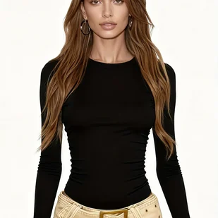 TEMU Elegancka Damska Bluzka z Długim Rękawem - Dopasowany Fason, Okrągły Dekolt, Jednokolorowa, Uniwersalna na Każdą Porę Roku, Idealna na