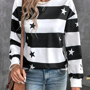 TEMU Elegancka Bluzka Damska z Długim Rękawem i Nadrukiem Gwiazd - Idealna na Styl Morski i Casual, Pranie w Praniu Maszynowym, Stylowa i Subtelna,