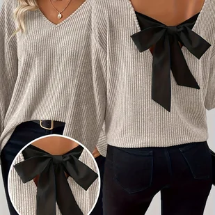 TEMU Damska Modowa Koszulka z Dekoltem w Serek i Długim Rękawem z Kokardą na Plecach