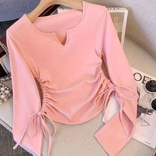 TEMU Elegancka Damska Koszulka z Długim Rękawem i Dekoltem w Serek - Jednokolorowy, Elastyczny Pulower, Casualowy Top na Każdą Porę Roku, Jasnoszary,