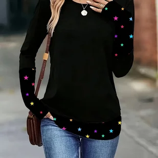 TEMU Elegancka Damska Koszulka z Długim Rękawem w Gwiazdki - Czarna i Wielokolorowa Bluzka z Kontrastowymi Rękawami i Okrągłym Dekoltem, Średnio