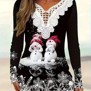 TEMU Elegancka Damska Tunika z Długim Rękawem w Świąteczne Wzory Płatków i Bałwanków – Czerwono-Biała Stylizacja na Zimowe Przyjęcia, Falbankowy