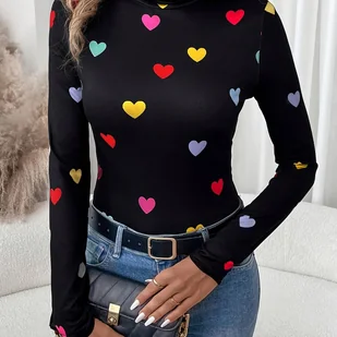 TEMU Elegancka Tunika Damska z Długim Rękawem i Wzorem Serc - Multikolorowy Motyw (Róż/Czerwony Niebieski Fiolet Żółty Biał Czarn) – Koszulka