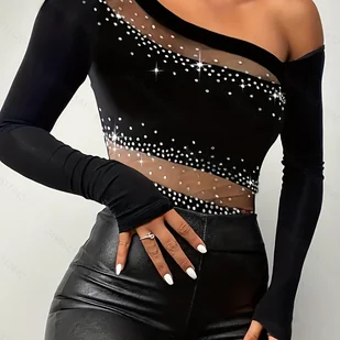 TEMU Wiosenna/Jesienna Damska Bluzka z Długim Rękawem, Prześwitowa, Dopasowana, z Siatki