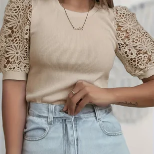 Taifun Damska bluzka z mieszanką materiałów, krótki rękaw, przecięte ramiona, koszulka z krótkim rękawem, okrągły dekolt, jednokolorowa, białawy, 46