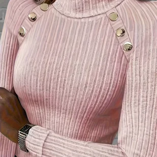 TEMU Elegancki, jednokolorowy, dzianinowy top z długim rękawem i wycięciem pod szyją, z dekoracją z poliestrowych guzików, na jesień/zimę
