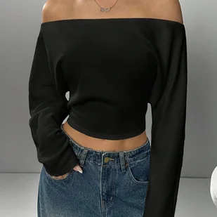 TEMU Europejska i Amerykańska Damska Bluzka z Odkrytymi Ramionami, Długi Rękaw, Krótki Fason, Jednokolorowa