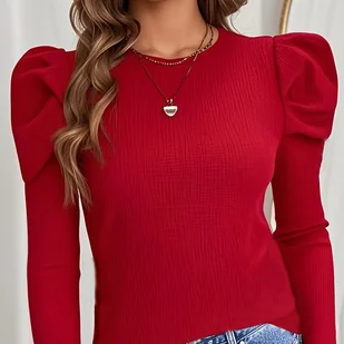 TEMU Kobieca Elegancka Bluzka z Długim Rękawem w Jednolitym Kolorze z Bufkami na Ramionach i Marszczeniami - Okrągły Dekolt, Regularny Krój, Pranie