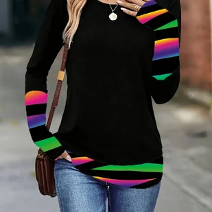 TEMU Kobieca Elegancka Koszulka z Długim Rękawem - Żywe Paski i Nadruk w Kolorowe B, Regularny Krój na Jesień Zimę, Wszechstronna od Codziennego do