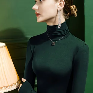 TEMU Damska bluzka z długim rękawem, z wysokim dekoltem, w jednolitym kolorze, z włókna modalnego | Elegancki, dopasowany krój, kolekcja jesień/