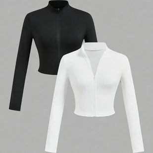 TEMU Kobiety Casual Dwuczęściowy Zestaw - Dopasowany Długi Rękaw Zamek & Jednokolorowy Crop Top, Szczegół Zamek, Okrągły Dekolt, Kolekcja