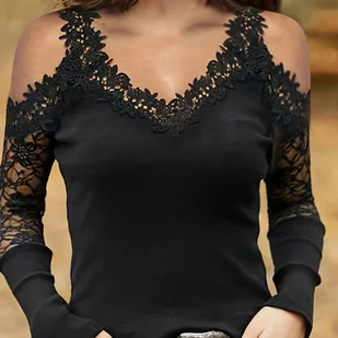 TEMU Kontrastowa koronkowa koszulka z odkrytymi ramionami, swobodna koszulka z długim rękawem na wiosnę i jesień, odzież damska