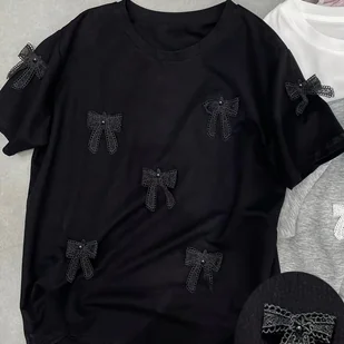 TEMU Koszulka Damska Casual z Czarną Kokardką – Miękki, Elastyczny Materiał, Pranie w Praniu Maszynowym, na Każdą Porę Roku, Jednokolorowa Bluzka,