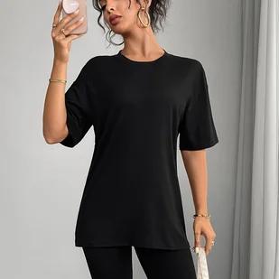 TEMU Koszulka Damska Casual z Okrągłym Dekoltem i Krótkim Rękawem - Jednokolorowa Czarna, Średnio Elastyczna, na Każdą Porę Roku, Silueta H-Line,