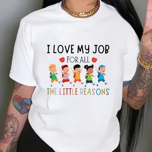 TEMU Koszulka damska "I Love " w jasnoróżowym kolorze z nadrukiem - krótki rękaw, okrągły dekolt, casualowa bluzka z kolorowymi postaciami, pranie