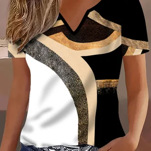 TEMU Koszulka Damska z Dekoltem w Serek - Krótki Rękaw, 3D Geometryczny Wzór ze Złotymi Akcentami Brokatu, Czarno-Biały , Oddychająca Bluzka Letnia,