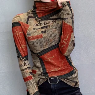 TEMU Damska koszulka z długim rękawem i nadrukiem, z pół wysokim kołnierzykiem, idealna na jesień i zimę. Casualowy design patchworkowy z ozdobnymi