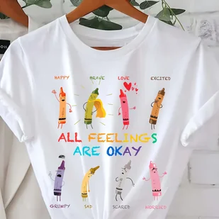 TEMU Koszulka Damska z Krótkim Rękawem w Kolorowe Grafiki "8 Emocji Ołówkowych" i Napisem „Wszystkie Uczucia Są W Porządku” – Casualowa, Letnia i
