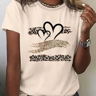 TEMU Koszulka Damska z Wzorem Lamparta i Sercem - 100% Poliester, Lekka 230gsm, Krótki Rękaw z Złotymi Akcentami Brokatu, Luźny Fason na Wiosnę & ,