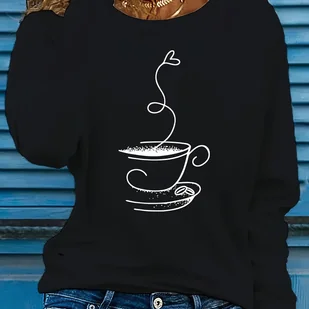 TEMU Koszulka z Długim Rękawem w Motywie Kawowym - Nadruk Białych Ziaren Kawy i Parującej Filiżanki, Okrągły Dekolt, Czarna Koszulka dla Miłośników