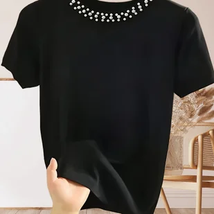 TEMU Koszulka z Eleganckim Efektem Perłowym dla Kobiet – Casual i Formalna, Nieprześwitująca Czarna Bluzka na Każdą Porę Roku, Uniwersalny Styl,