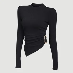 TEMU Modna czarna koszulka damska z nieregularnym okrągłym dekoltem i długim rękawem, idealna na jesień i zimę, stylowa i dopasowana.